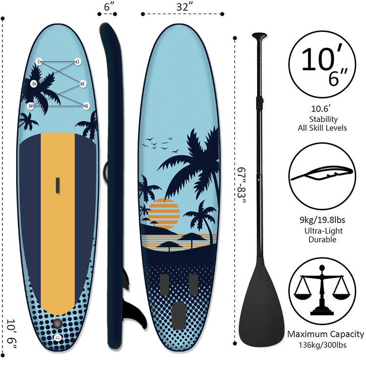 - ΣΤΑΘΕΡΟΣ-Επιπλέον ευρέως (32») και παχύς (6») για την ακαμψία και τη μέγιστη σταθερότητα. Κατάλληλη μέχρι και 2 ανθρώπους, η μέγιστη ικανότητα είναι μέχρι 300 λίβρες. Τα paddleboards ΓΟΥΛΙΑΣ είναι ιδανικά για όλα τα επίπεδα ικανότητας να κάνουν τη γιόγκα, το σερφ, την αλιεία, να περιοδεύσουν, την κολύμβηση με αναπνευστήρα, ή την ψυχαγωγική κωπηλασία.