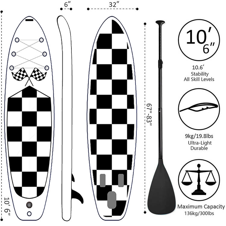 - Συσκευασία συμπεριλαμβανομένου του πίνακα, του διευθετήσιμου κουπιού αργιλίου, της υψηλής αντλίας, του σακιδίου πλάτης ταξιδιού, του λουριού σπειρών και των μετακινούμενων πτερυγίων.