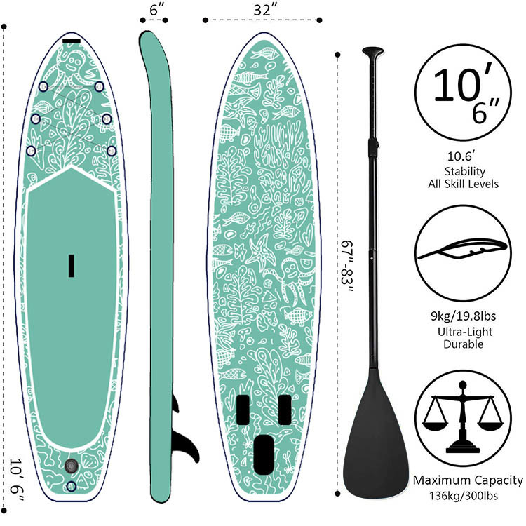 - Χωρητικότητα μεγέθους & φορτίων: Το μέγεθος του διογκώσιμου πίνακα κουπιών είναι 10 " 6 " ×32 " ×6». Είναι εξαιρετικά-ευρύ σχέδιο για τη βελτιωμένη σταθερότητα και η ισορροπία στεμένος, και αυτό είναι χωρητικότητα φορτίων μέχρι 300 λίβρες το καθιστά κατάλληλο για όλα τα επίπεδα ικανότητας.