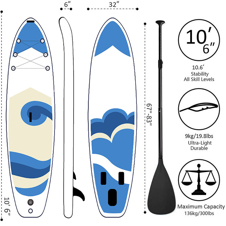- [ΕΛΑΦΡΥ, ΑΝΘΕΚΤΙΚΟ ΣΧΕΔΙΟ] κατασκευασμένος με το PVC ασφαλίστρου και προηγμένος κολλώντας την τεχνολογία το κάνετε ένα μακράς διαρκείας paddleboard. Το τρέξτε με το όχημά σας, το ρίξτε από τη στέγη ή το χώστε στους βράχους ή μια αποβάθρα δεν θα το βλάψει. 10 " 6» πολύ και 32» του πλάτους γεφυρών για τη βελτιωμένες σταθερότητα και την ισορροπία στεμένος. Το ανώτατο φορτίο είναι μέχρι 330lbs, ο όγκος είναι 240L.